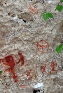 Omdat het nu laag tij is staat een heel brede strook (+/- 1 km) strand droog. Het witte zand lijkt eerder een zoutvlakte en door de kleine vulkaanachtige bergjes van de slakken en andere zeedieren lijkt het ook wel een maanlandschap. Dichter bij de rotsen wordt het steeds sompiger. We zakken tot over onze enkels in de prut. Op de grotachtige rotswanden wijst Jimmy ons de primitieve tekeningetjes aan, ooit door verre voorouders aangebracht. Een precieze jaartelling is nooit echt onderzocht.