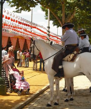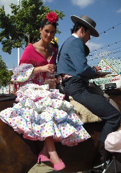 . | Het is er druk met Spaanse toeristen. De kledingwinkels, waar je de uitbundig met stroken versierde jurken kunt kopen, doen goede zaken i.v.m. de Feria de Sevilla aanstaande week. | ![]() |