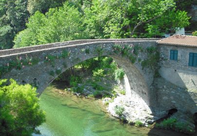 Maandag 24 mei. De directe omgeving van de camping vinden we niet geweldig. We zitten midden in het kassengebied van de Bloemen Rivièra en de bergen op de achtergrond zien er een beetje kalig uit. De badplaatsen in de buurt zijn tamelijk bescheiden en rommelig. Vandaag besluiten we een rondje in het binnenland te rijden. Al na een km of 10 bereiken we het dorpje Cisano. Dit typisch Italiaanse plaatsje ligt prachtig in de natuur aan een snelstromend riviertje. Je kunt er zwemmen en daarna lekker uitrusten op de rotsen. Vanwege de oude Romeinse brug doet het ons sterk aan de Ardeche of Tarn denken. We kronkelen langzaam verder omhoog langs Castelbianco en zijn oude burcht en stappen even uit in Alto en maken wat foto's in de privé-tuin van het kasteel. In het plaatselijke kerkje verbazen we ons over de kleurrijke en kunstige beschilderingen (1753).